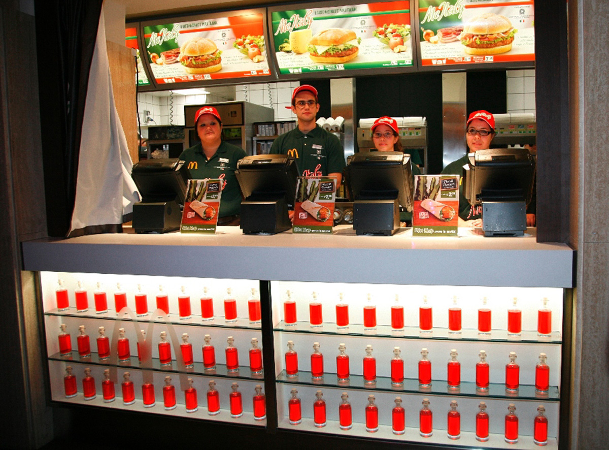 Once every body was in, some blitz performed by a variety troupe have remarked the new certified menu products themes, in the meanwhile some corners started offering thematic appetizers. Two lightened curtains were hiding the classic fast-food counter waiting for the highlight moment.