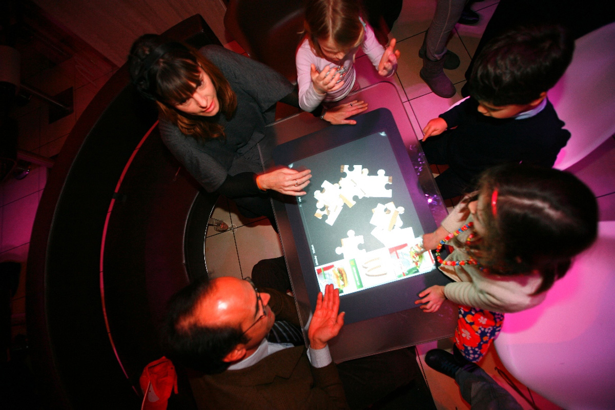 At the way in, gests were welcomed by a dj-set and a soft lighting that changed the perception of the usual place. Along the discovering of this new place people found some interactive exhibits to play with, as a touch table that introduced the gastronomic themes of the soirée.