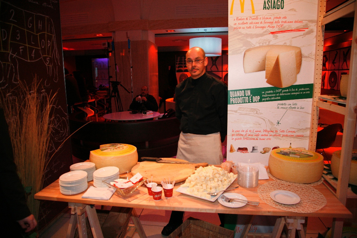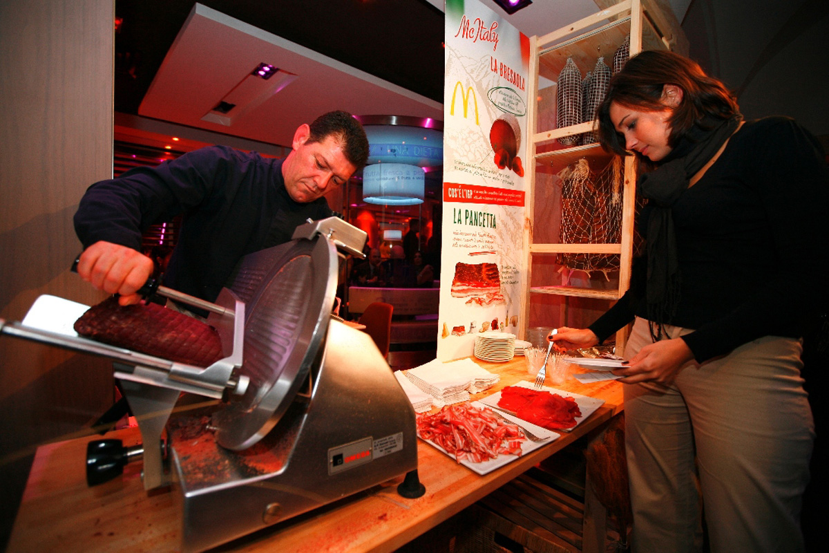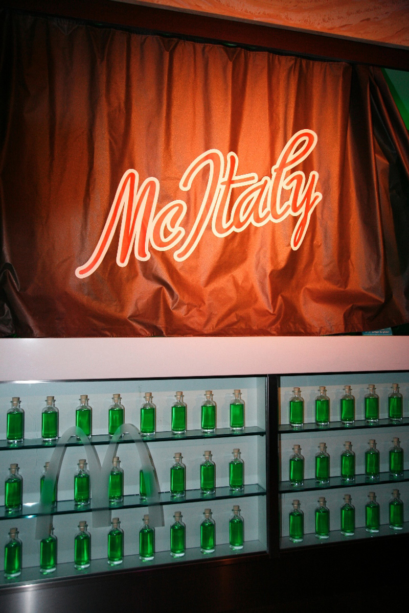 Una volta arrivati tutti, delle incursioni di fantasisti hanno ulteriormente rimarcato i temi dei nuovi prodotti “doc”, “dop” e ‘igp’ del menù, mentre dei corner hanno iniziato a dispensare antipasti sempre a tema. Due sipari illuminati nascondevano il classico banco casse del fastfood in attesa del momento clou.